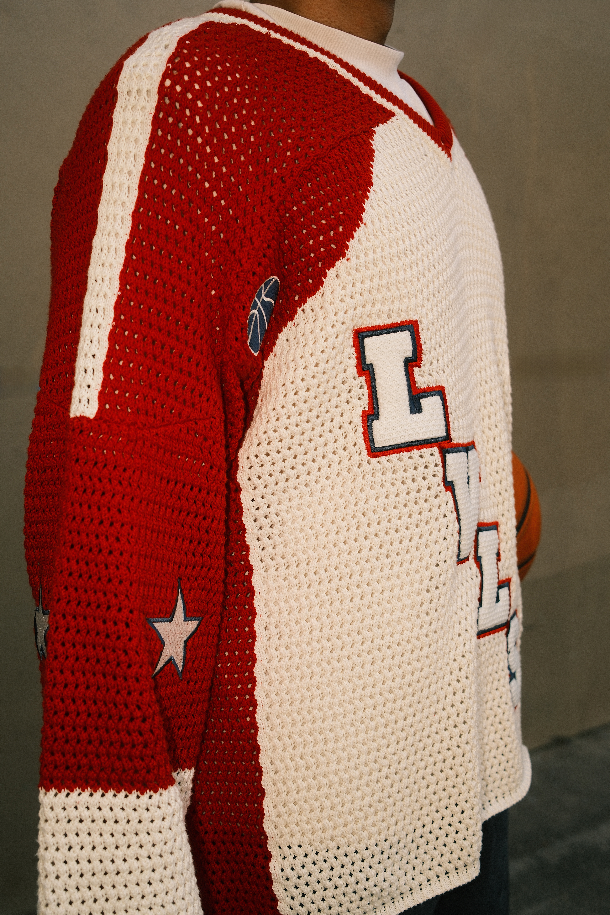 Inspired by throwback All Star jerseys, this jersey is a knit with premium cotton yarn paired with sewn-on patches, 3D crocheted and embroidered logos.